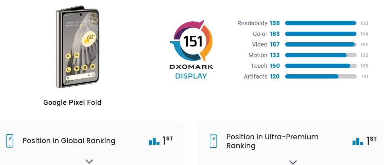 Складной смартфон Google Pixel Fold в тестах DxOMark получил 151 балл за свой экран и с этим результатом возглавил соответствующий рейтинг. Pixel Fold получил столько же баллов, сколько их на счету Honor Magic5 Pro, при этом он обошёл все флагманы Apple и Samsung, которые традиционно славятся качеством дисплеев. Вообще это первый случай в истории DxOMark, когда экранный рейтинг возглавила складная модель.