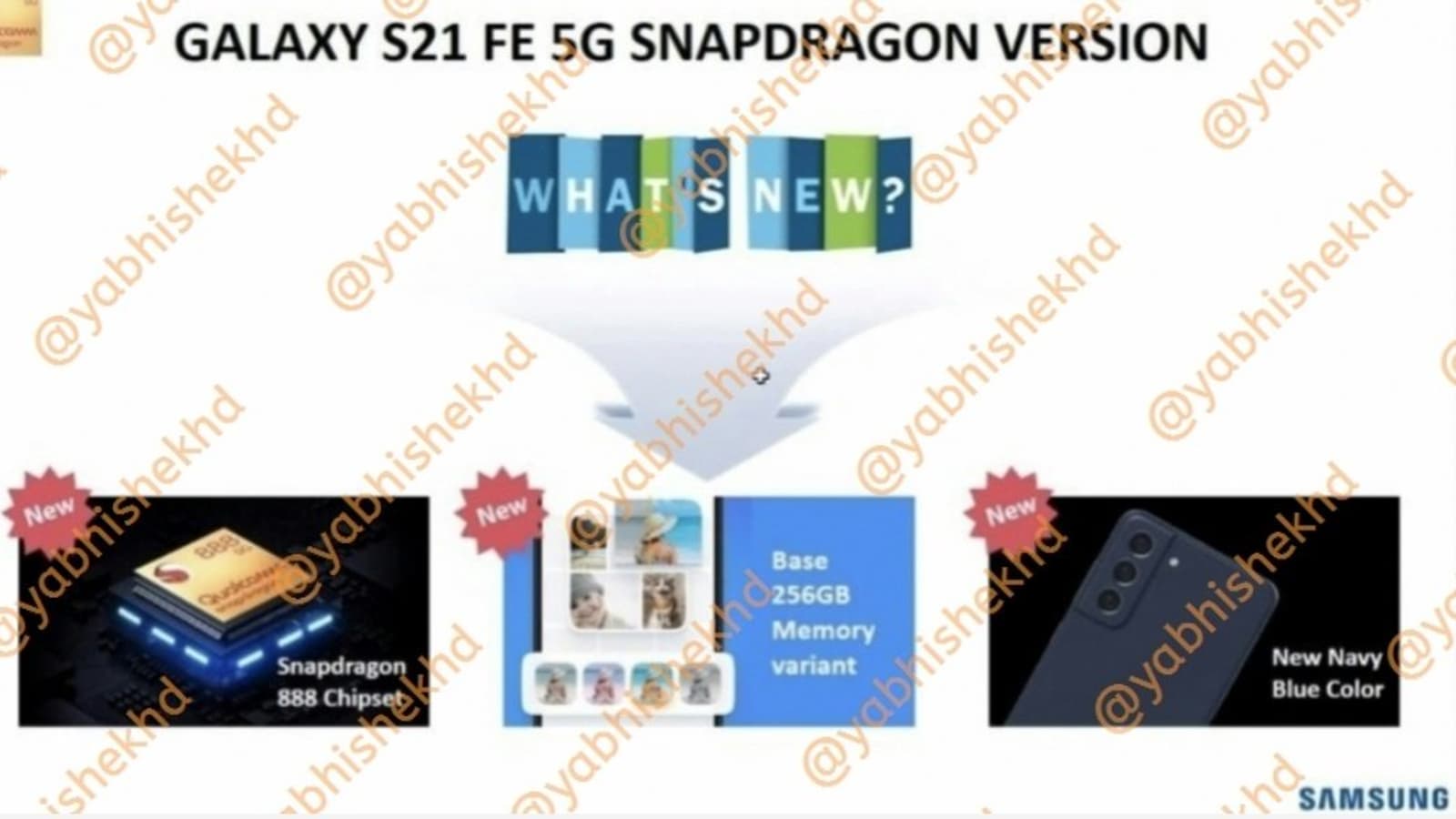 Инсайдер Абхишек Ядав (Abhishek Yadav) опубликовал картинку, где видно, что Samsung специально отмечает отличительные черты нового S21 FE от старого. Как и говорилось в утечках, это Snapdragon 888 вместо Exynos 2100, 256 ГБ флэш-памяти в базе, а ещё новый цвет.