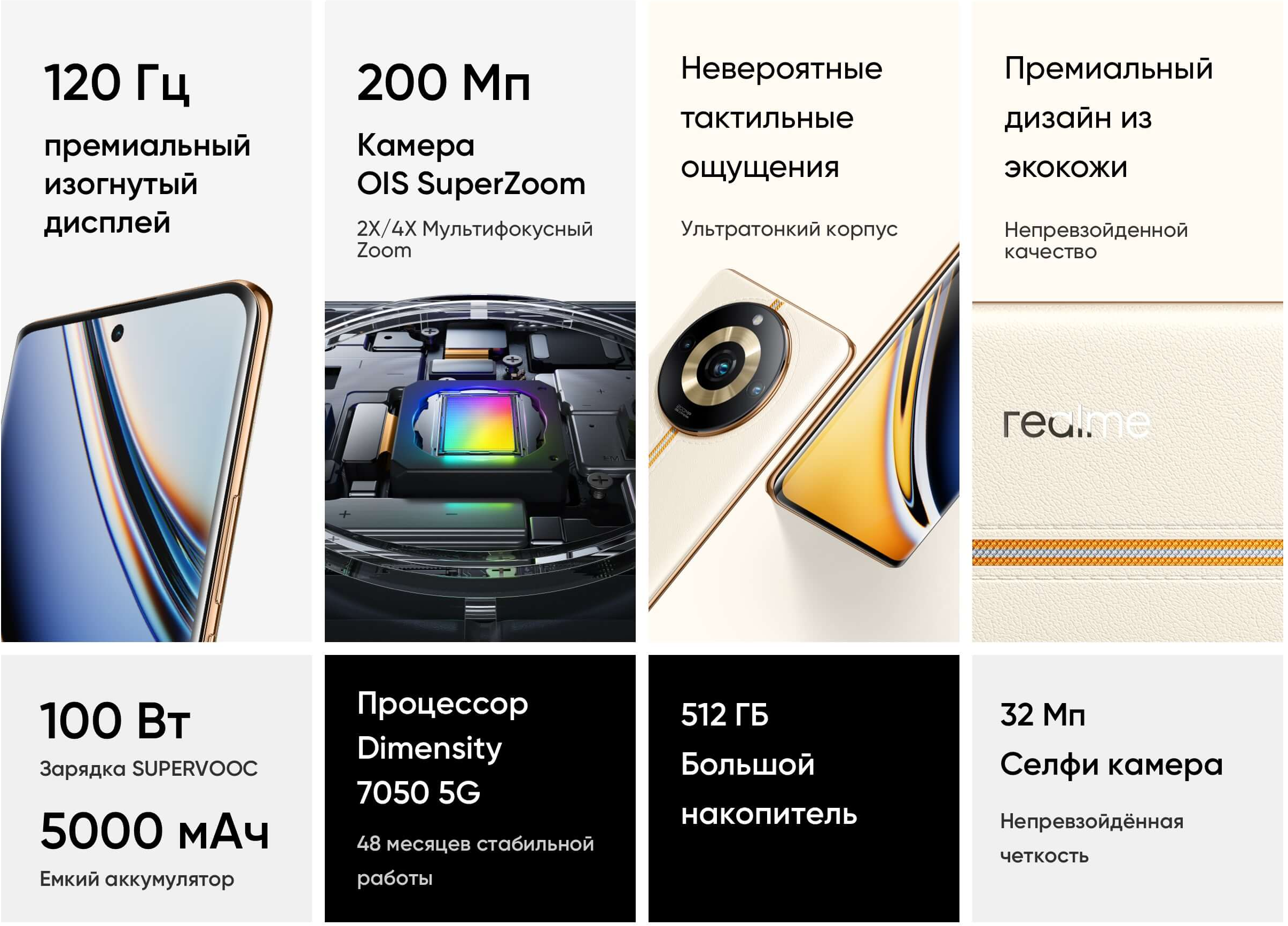 Среди характеристик Realme 11 Pro+ — основная камера Samsung ISOCELL HP3 на 200 Мп, фронтальная камера на 32 Мп, а также с поддержка зарядки на 100 Вт. Базовый Realme 11 Pro получил более простые 108 и 16 Мп, поддержку зарядки на 67 Вт.