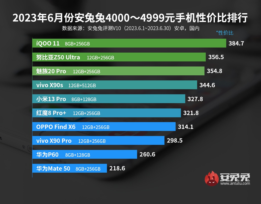 В категории от 4000 юаней до 4999 юаней (от 555 до 692 долларов) лидируют iQOO 11, Nubia Z50 Ultra и Meizu 20 Pro.