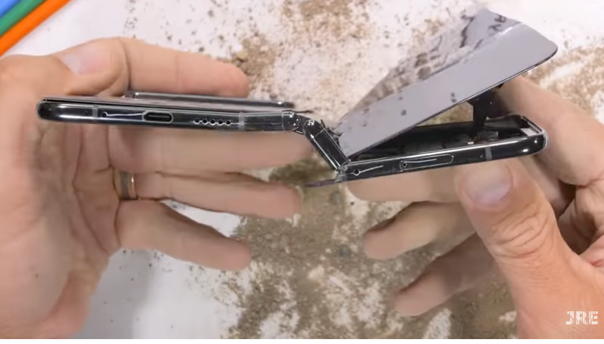 И последний тест, тест на изгиб, вывел смартфон из строя — оказалось достаточно одного нажатия в «неправильном» направлении. Внутренний экран сохранил способность выводить изображение лишь в небольшой своей части, а сам смартфон перестал закрываться до конца. При этом у него не предусмотрено никакой аппаратной «страховки» от такого неправильного изгиба. Несколькими движениями Нельсону удалось доломать смартфон окончательно, добравшись даже до аккумулятора. Google рекламирует шарнир как самый прочный в мире, и Нельсон иронизирует, что шарнир как раз уцелел — сломались все остальные части смартфона.