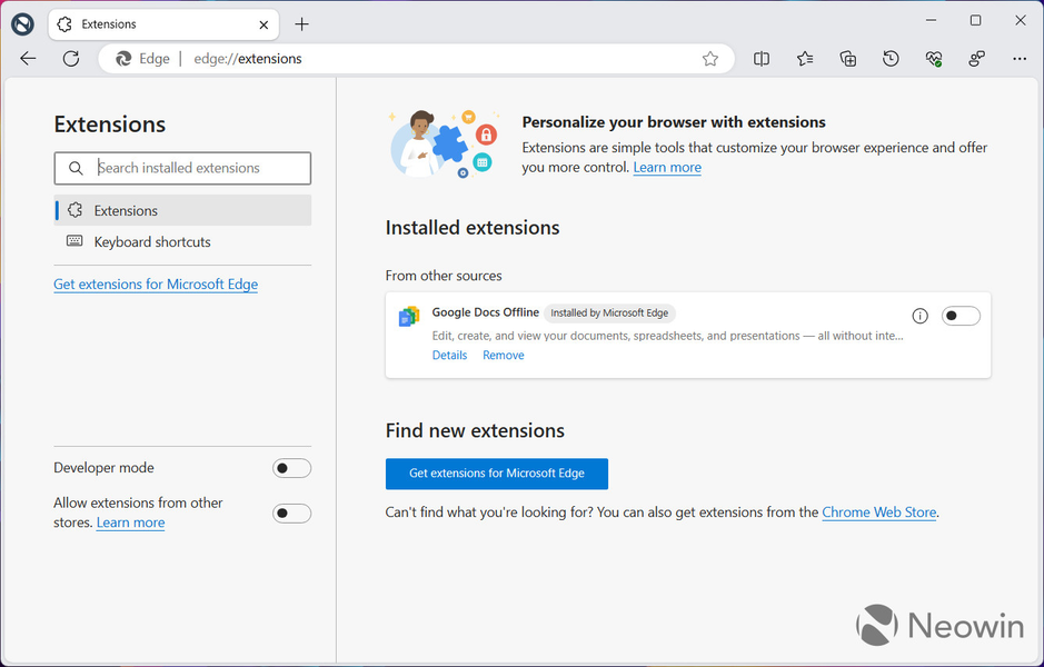 К счастью, удалить нежелательное расширение можно — достаточно перейти по адресу edge://extensions и нажать кнопку «Удалить» рядом с «Google Docs Offline».