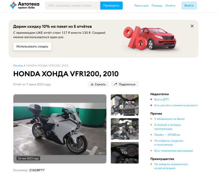 Команда популярного сервиса частных объявлений «Авито» сообщила о запуске новой возможности в сервисе «Автотека». Как рассказали в пресс-службе, в «Автотеке» теперь можно проверить техническое состояние мотоциклов и историю их владения в России.