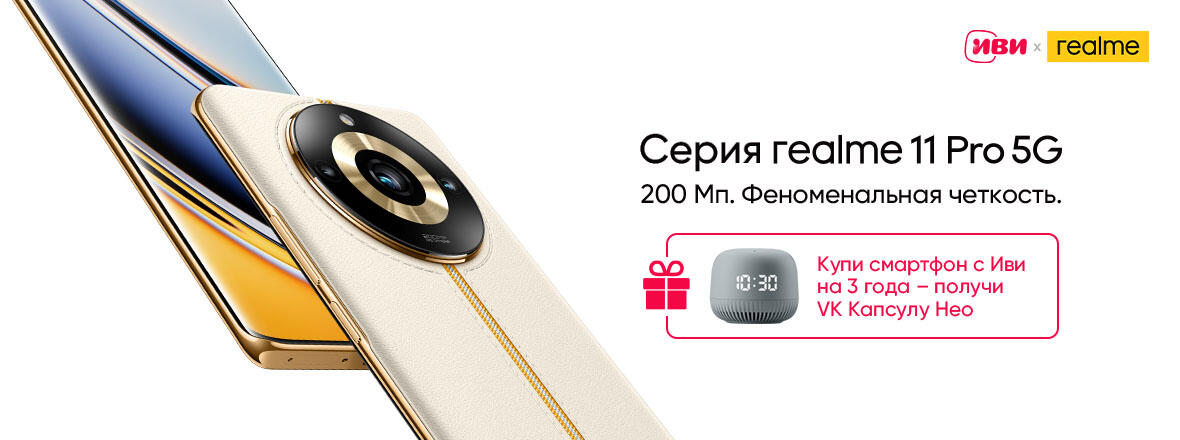 - Realme 11 Pro+ 5G с 256 ГБ — рекомендованная розничная цена 39 999 рублей, по акции с колонкой суммарная стоимость 35 999 рублей;