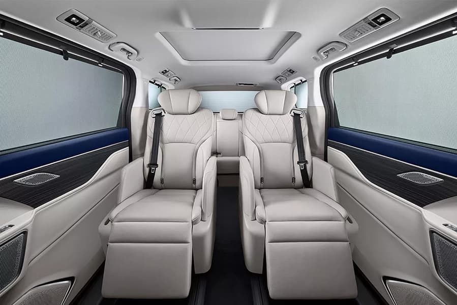 А тут (в салоне) раздельные кресла второго ряда с десятиточечным массажёром, вентиляцией и обогревом. Для ног пассажиров второго ряда масса места: между спинками передних кресел и этими сиденьями 1,2 метра! Пространства для ног пассажиров третьего ряда поменьше, но в целом всё равно немало — 96,2 см. Сиденья минивэна могут быть сложены соотношением 4 к 6, а максимальный объём багажного отделения достигает 1725 литров. А ещё тут есть автономный холодильник объёмом 12,5 литра.