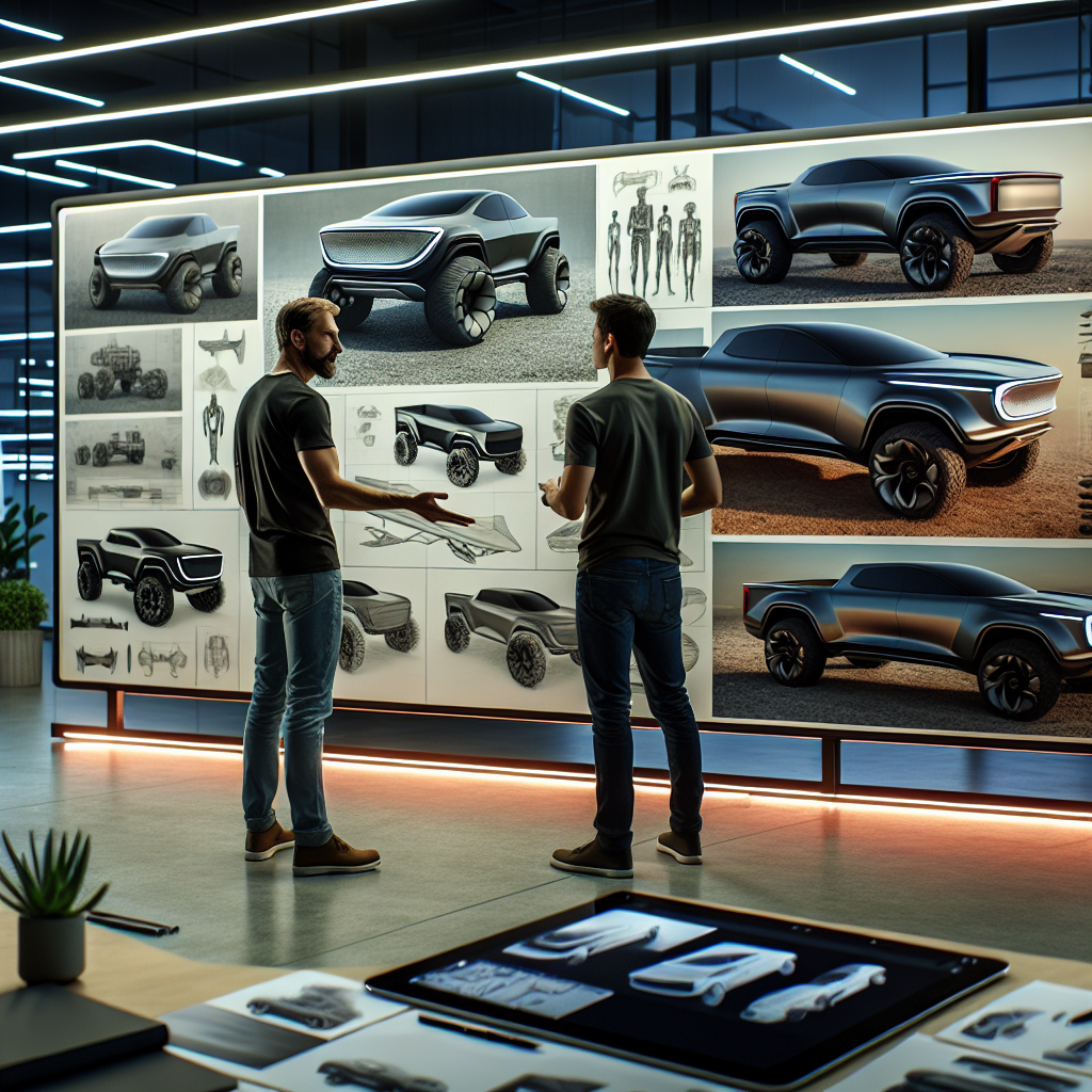Как рассказал Айзексон, Маск считал, что пикапы Ford были «скучными» и собрал разные образы из фильмов, научной фантастики и видеоигр для вдохновения. Стенд с такими образами он продемонстрировал на одной из встреч, посвящённых разработке будущего авто. На фото видно этот стенд, а также ранние наброски вариантов дизайна Cybertruck. На переднем плане Маск разговаривает с главным дизайнером Tesla Францем фон Хольцхаузеном.