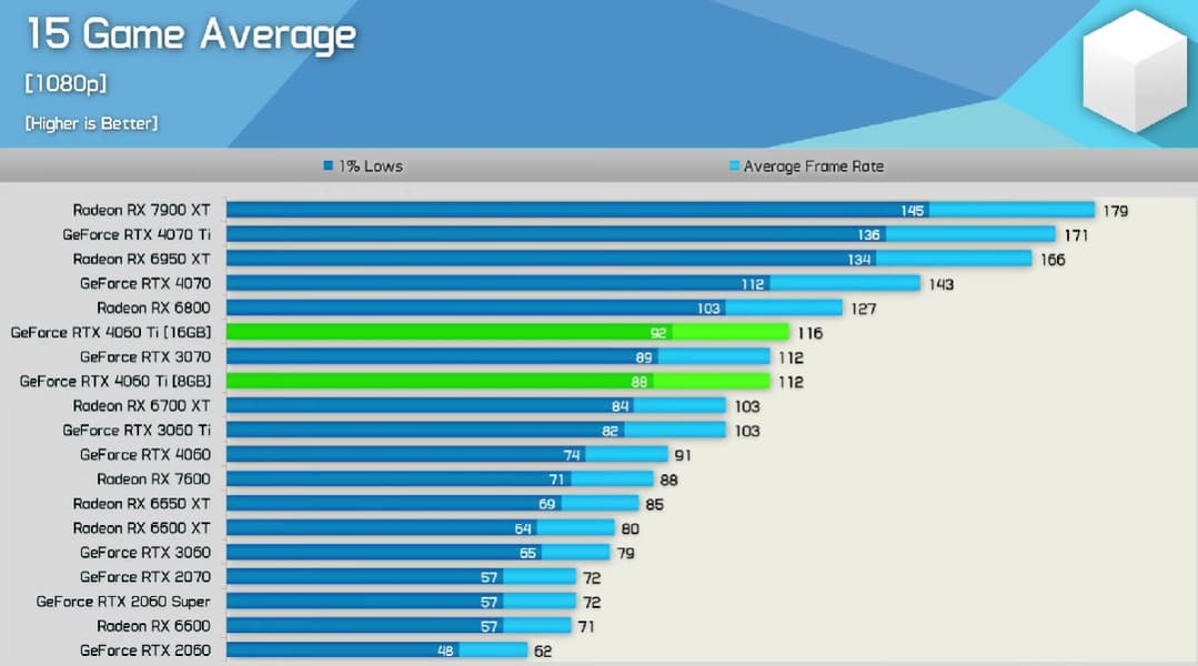 Правда, если смотреть только общие результаты, то так не кажется. RTX 4060 Ti 16GB обходит RTX 4060 Ti 8GB в среднем на 3–4%, чем можно пренебречь. То есть разницы нет никакой, причём не только в Full HD, но и в 1440p. В 4K, вероятно, она будет уже более ощутимой, но эта видеокарта не предназначена для такого разрешения, если говорить о современных требовательных играх.