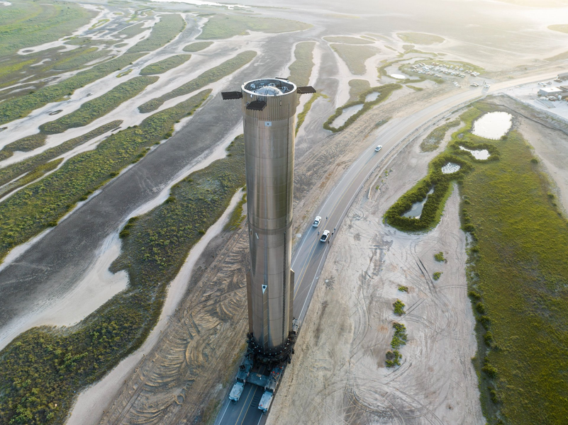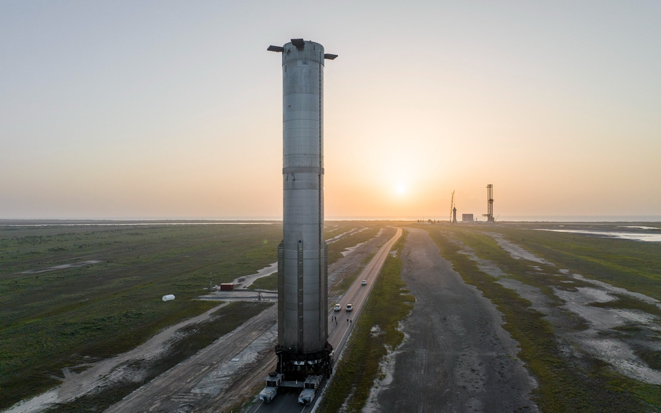Космическая компания SpaceX доставила новейший прототип огромного ускорителя Starship Super Heavy на свою орбитальную стартовую площадку Starbase в Бока-Чика для испытаний перед следующим запуском.