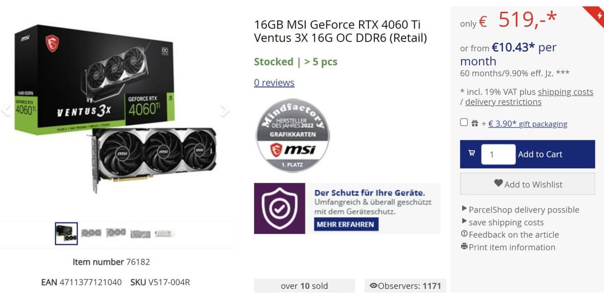 В Европе есть уже несколько предложений с ценой ниже 550 евро, которая тут является рекомендованной. Карту можно купить минимум за 519 евро, и это будет адаптер MSI гигантских, как для этого класса размеров.