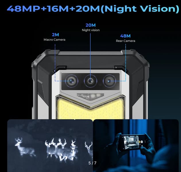 Смартфон оснащен аккумулятором ёмкостью 10 000 мА•ч, а также 48-мегапиксельной основной камерой Samsung и 20-мегапиксельной камерой ночного видения Sony. Третья камера для макро имеет разрешение 2 Мп. Прочность и долговечность смартфона соответствуют военному стандарту MIL-STD-810Н, а также степени IP68/IP69.