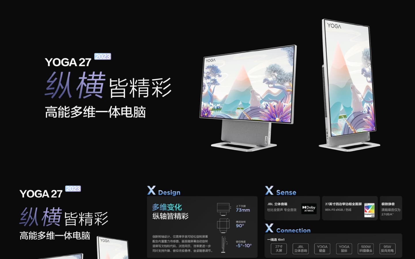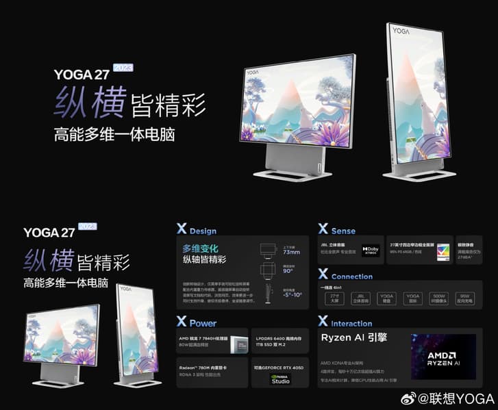 Lenovo Yoga 27 2023 оснащен 8-ядерным процессором Ryzen 7 7840H с TDP 80 Вт. Оперативная память – LPDDR5, но ее объем не указан. Для установки SSD предусмотрены два слота. 27-дюймовый экран характеризуется разрешением 4К, также он обеспечивает охват 95% цветового пространства DCI-P3. Интересной особенностью новинки является возможность перевода экрана из альбомного режима работы в портретный.