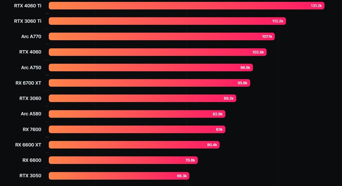 Там в тесте OpenCL новинка набрала почти 83 000 баллов, что очень неплохо. Это результат уровня новой Radeon RX 7600 и лишь чуть ниже, чем у RTX 3060.