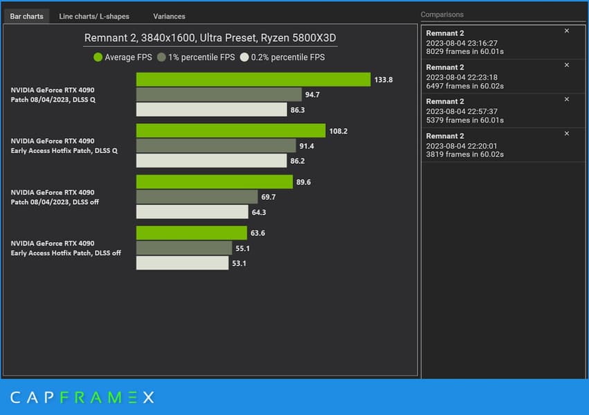 Полноценных тестов новой версии нет, но RTX 4090 при максимальных настройках и разрешении 3840 х 1600 пикселей без DLSS 2 теперь показывает 90 к/с против прежних 64 к/с (конкретно у авторов CapFrameX), а при включении DLSS 2 производительность повышается со 108 до 134 к/с.