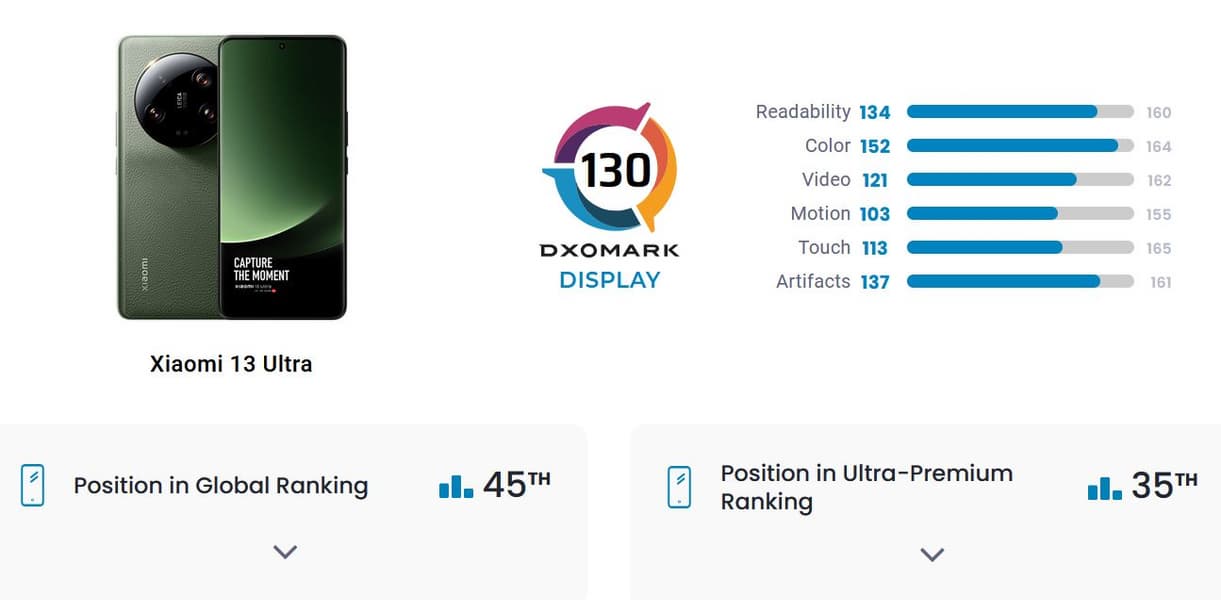 Если судить по результатам тестов DxOMark, то как-то не очень Xiaomi 13 Ultra соответствует своему флагманскому статусу: по части камеры лишь 14-е место соответствующего рейтинга, по качеству звука аппарат находится на 17-м месте, по тестам батареи — только на 29-м месте. Сейчас опубликован результат теста экрана — и он ещё хуже, чем результаты тестов камеры, звука или аккумулятора.