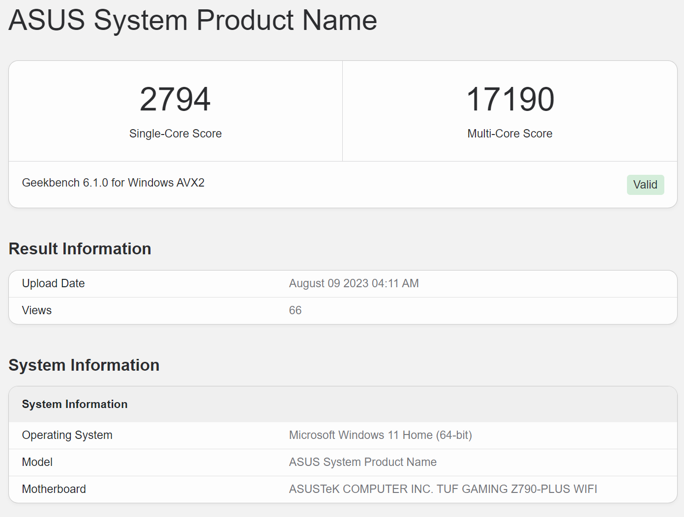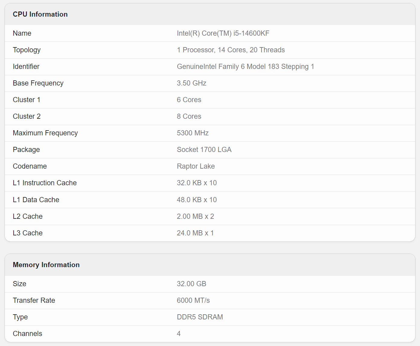 В базе данных бенчмарка Geekbench засветился процессор Intel Core i5-14600KF. CPU тестировался в составе готовой системы на базе материнской платы Asus TUF Gaming Z790-Plus Wi-Fi, и в этом нет ничего удивительного: Intel уже начала поставлять процессоры Core 14-го поколения своим партнёрам. Объём оперативной памяти DDR5-6000 составил 32 ГБ.