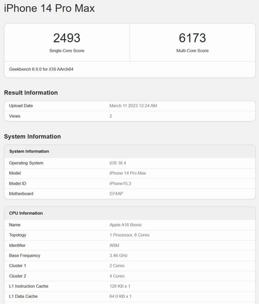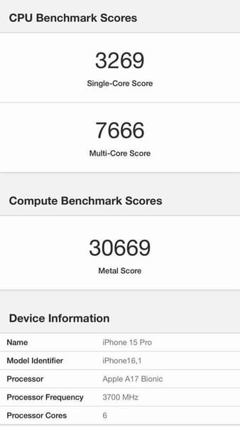Первый смартфон из новой линейки Apple засветился в бенчмарке Geekbench. Тестировали iPhone 15 Pro, обозначенный идентификатором iPhone 16,1. По данным тестового приложения, у платформы 6 ядер, а максимальная частота составляет 3,7 ГГц.