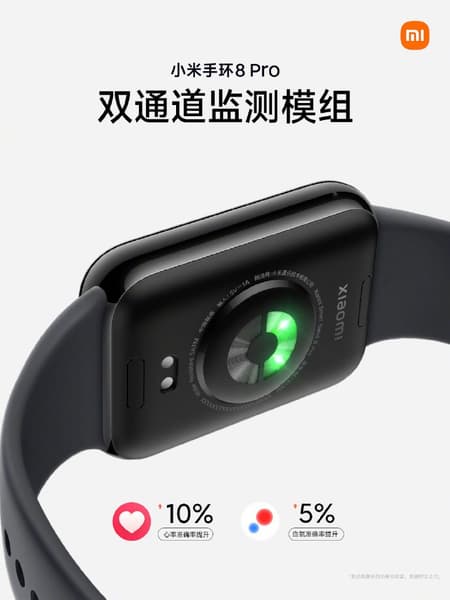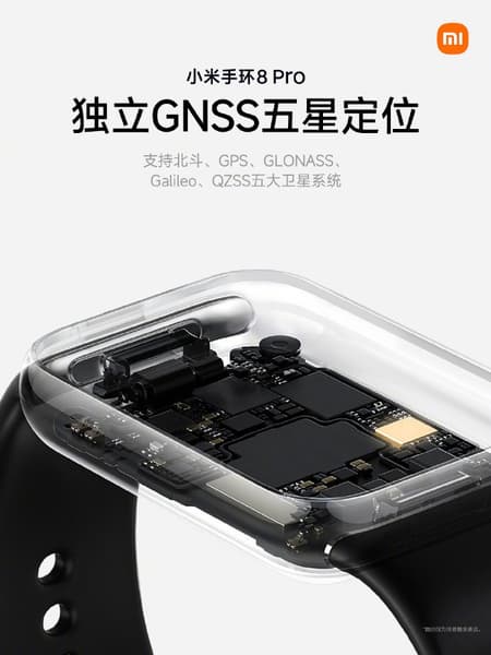 Xiaomi Band 8 Pro получил улучшенный двухканальный оптический датчик, который отвечает за определение ЧСС и уровня насыщения крови кислородом. Также есть чип NFC и приёмник GPS, предусмотрено более 150 режимов тренировок. Водозащита — 5ATM (купаться можно, но нырять нежелательно).
