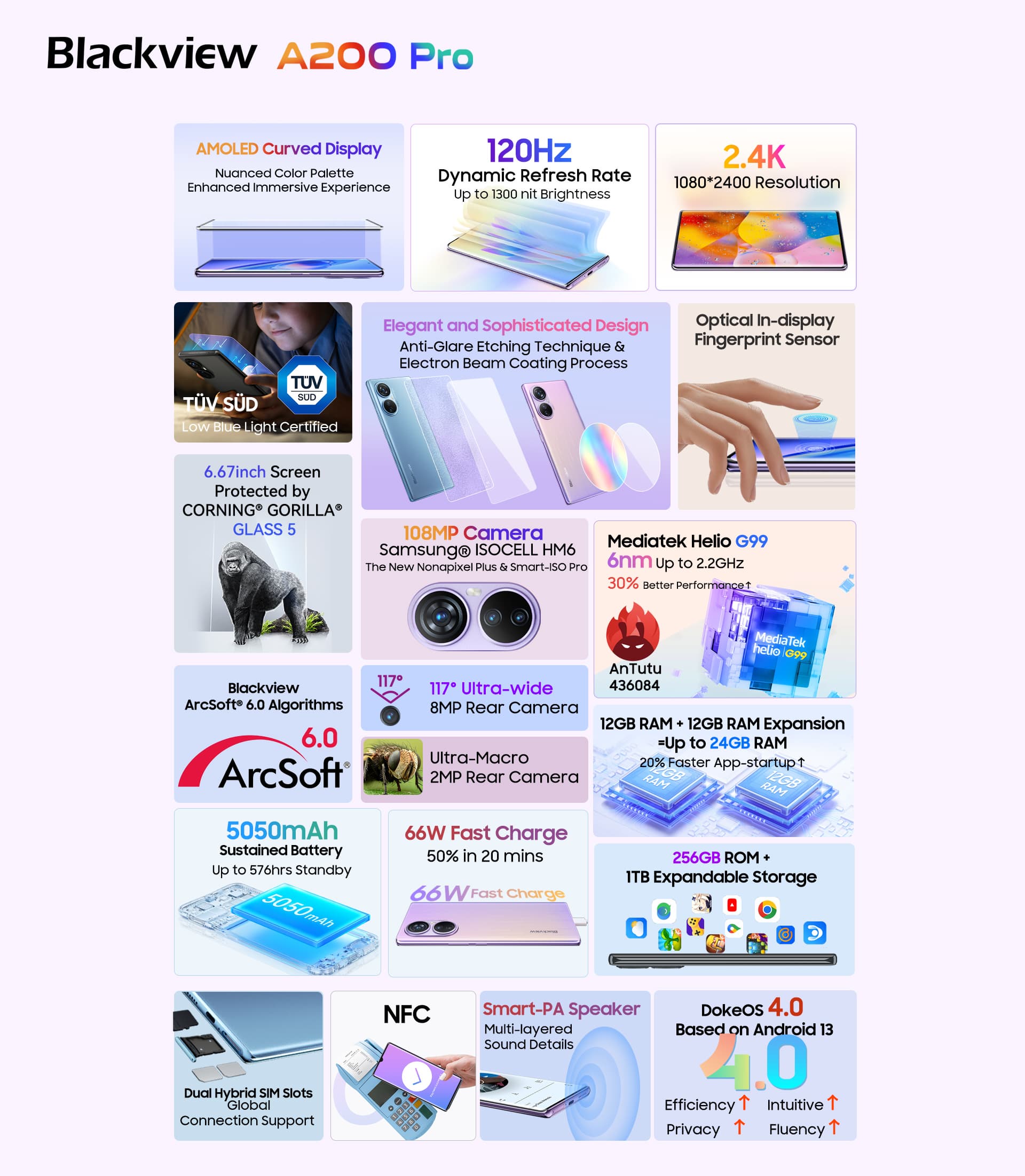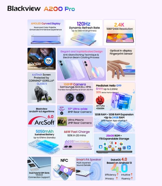 Сердцем смартфона выступает однокристальная система MediaTek Helio G99, которую дополняют 24 ГБ оперативной памяти (12 ГБ физической UFS 2.2 и 12 ГБ виртуальной), а также 256 ГБ флеш-памяти, которую можно увеличить на 1 ТБ с помощью TF-карты. Blackview A200 Pro набрал 436 084 балла в тестах Antutu.