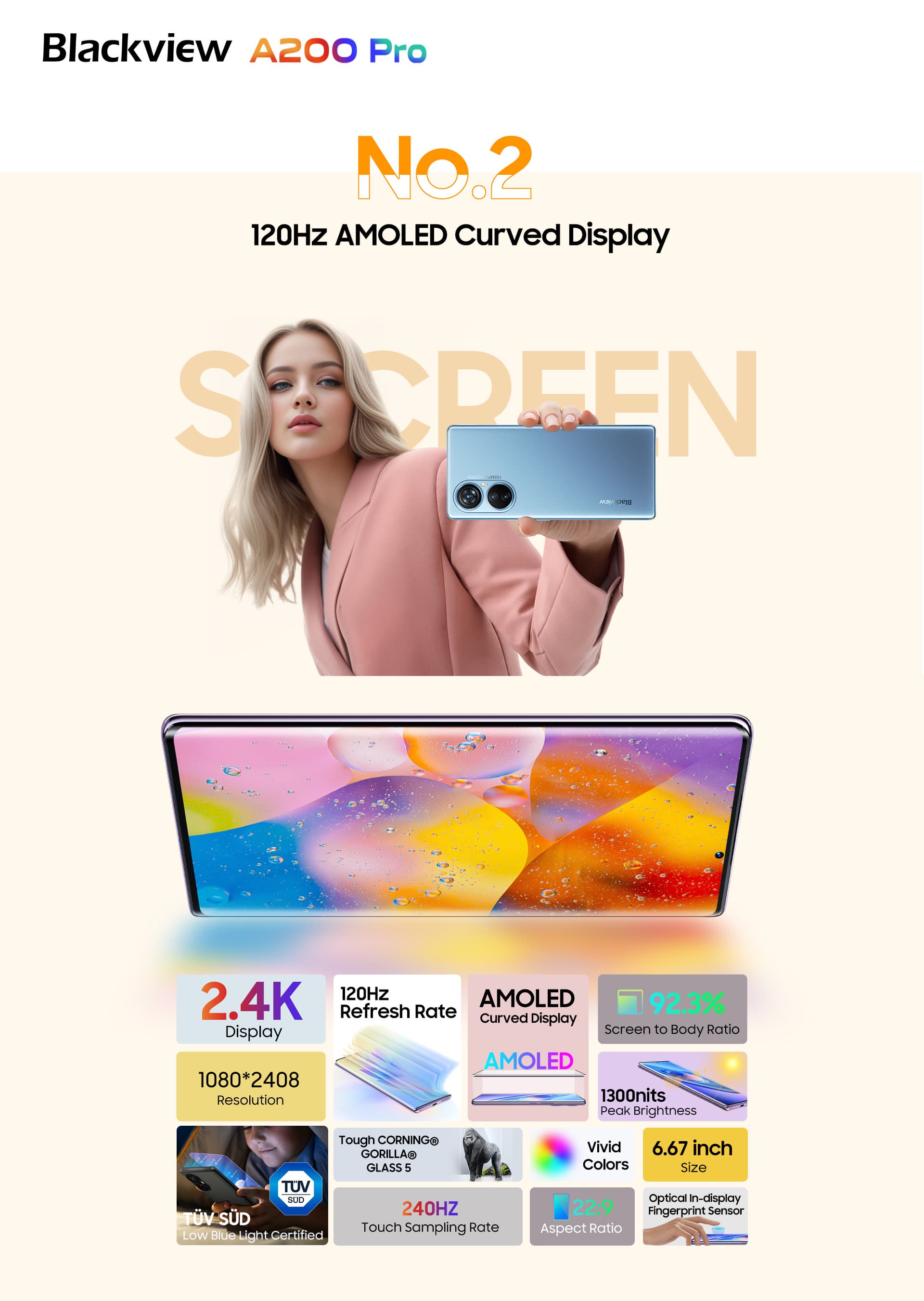 Blackview A200 Pro будет оснащён 6,67-дюймовым изогнутым экраном AMOLED, разрешением 2,4K с частотой обновления изображения 120 Гц. Дисплей получил сертификат TUV SUD Low Blue Light.