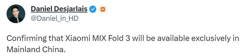 Об этом в Twitter написал глава PR-службы Xiaomi Даниэль Дежарле (Daniel Desjarlais). «Подтверждаю, что Xiaomi MIX Fold 3 будет доступен исключительно в материковом Китае», — сообщил он.
