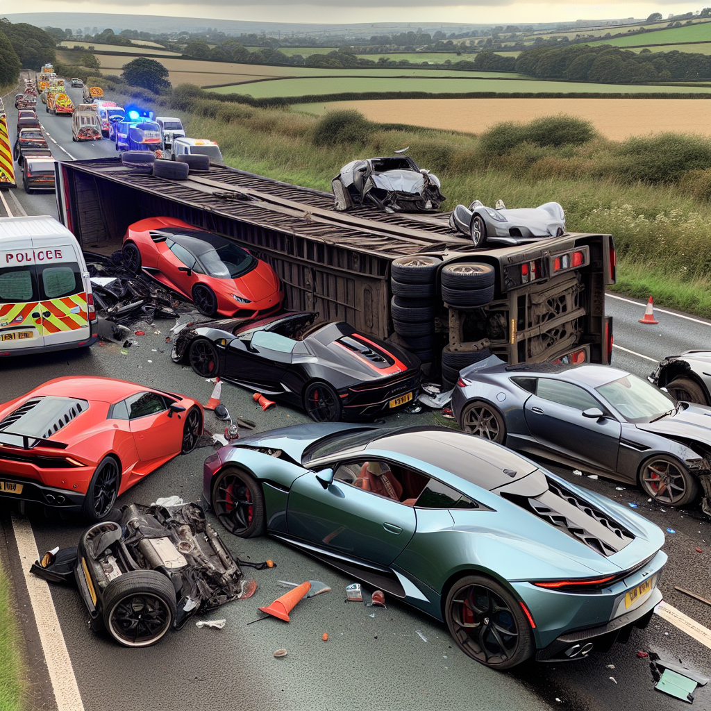 Дорогое дорожно-транспортное происшествие с роскошными автомобилями случило недалеко от Фарнингема, Великобритания. Водитель автовоза отделался лёгкой травмой, но большинство автомобилей получили заметные повреждения.