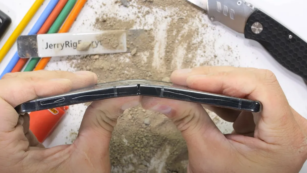 Наконец, складной смартфон прошёл испытание на изгиб. Интересно, что шарнир смог противостоять сильному изгибу (в направлении, противоположном стандартному), и признаков поломок и неполадок не было.