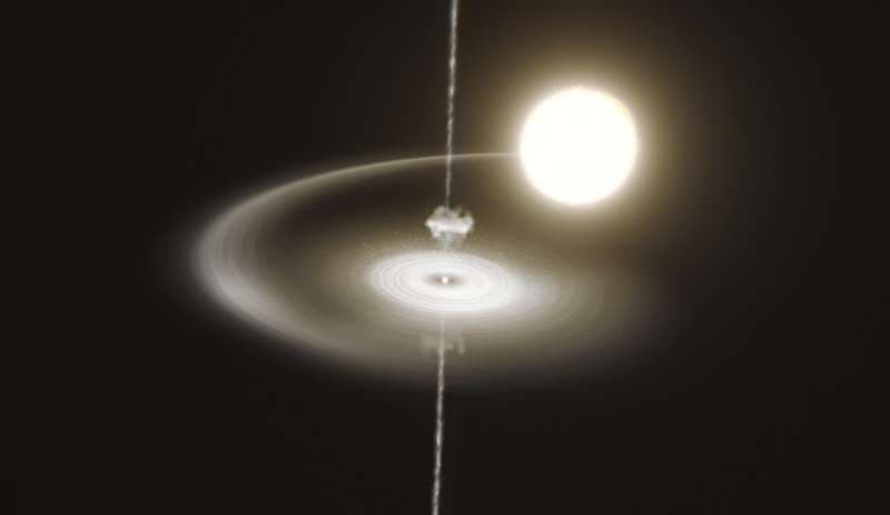 «Мы обнаружили, что переключение режимов происходит из-за сложного взаимодействия потока высокоэнергетических частиц, уносящихся от пульсара, и материи, движущейся к пульсару», — говорит Коти Зелати. В режиме низкой яркости материя, движущаяся к пульсару, выбрасывается в узком потоке перпендикулярно диску. Постепенно эта материя оказывается всё ближе к пульсару, и, по мере приближения, она попадает под влияние излучения от пульсирующей звезды, нагреваясь при этом. Система находится в режиме высокой яркости и ярко светится в рентгеновском, ультрафиолетовом и видимом свете. А при уменьшении количества нагретой материи в диске звезда возвращается в режим низкой яркости.