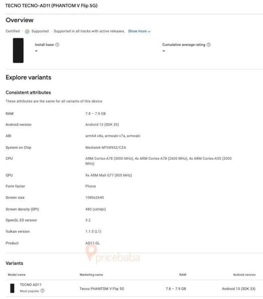 Складной смартфон Tecno Phantom V Flip засветился в Google Play Console, благодаря чему мы теперь знаем часть его характеристик.
