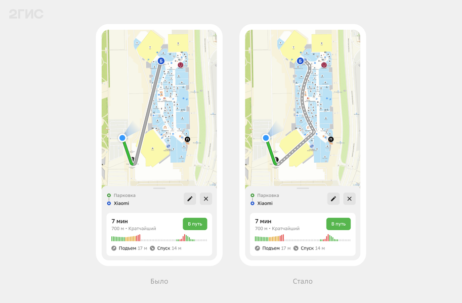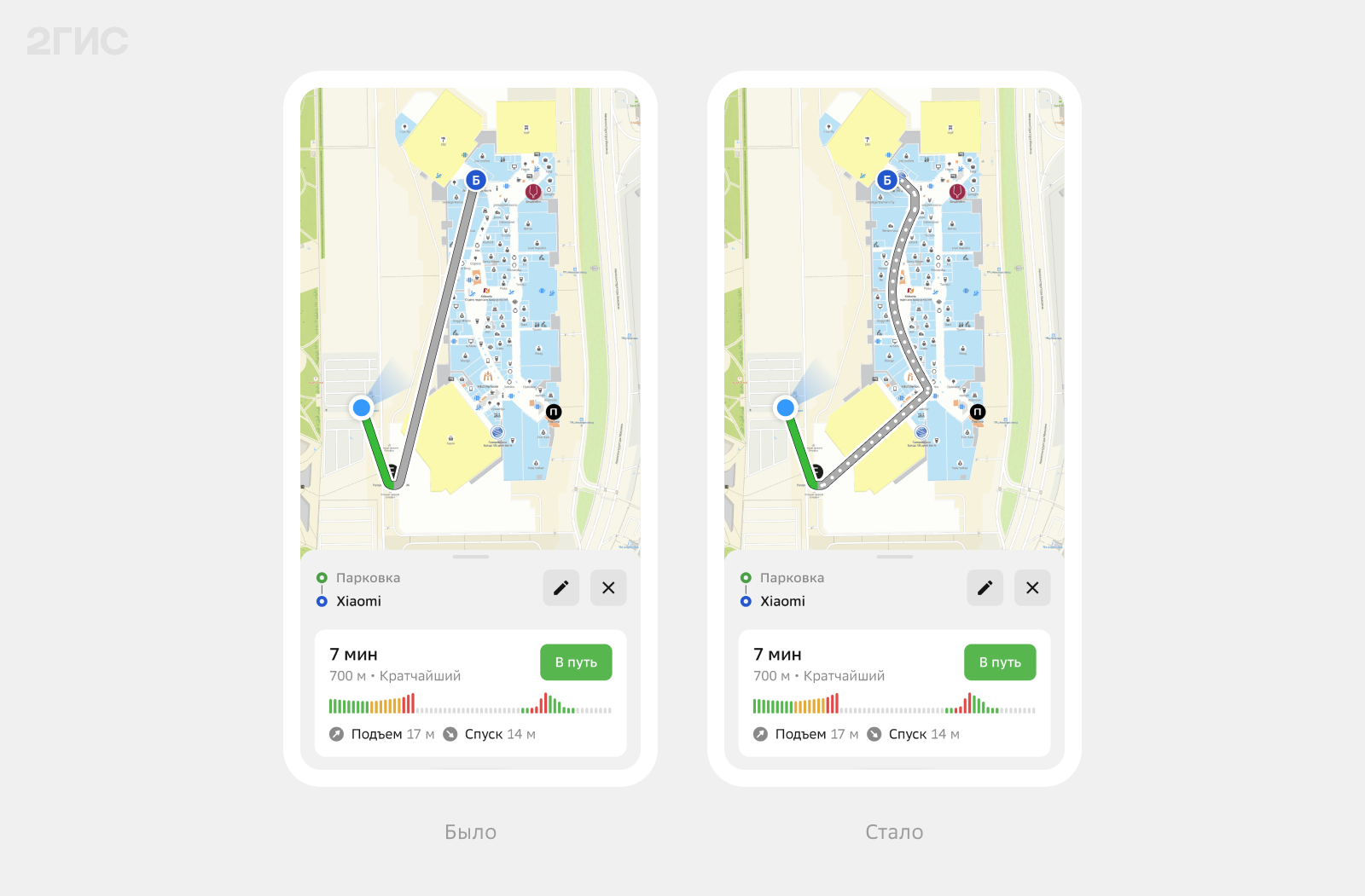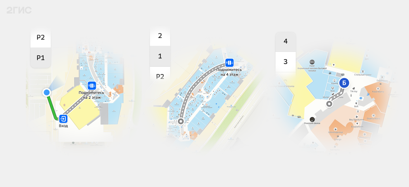В 2ГИС есть данные о проходах в ТЦ, лестницах, эскалаторах, лифтах, расположении магазинов и бутиков — чтобы уже сейчас это приносило больше пользы, мы выпустили обновление для пешеходного навигатора, которое позволяет строить маршруты внутри зданий в условиях отсутствия точной геопозиции пользователя.