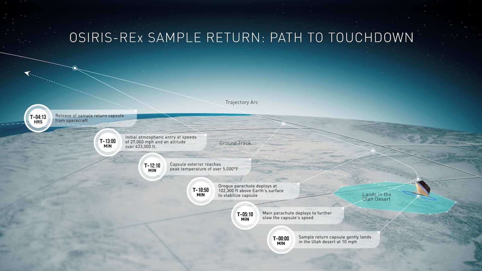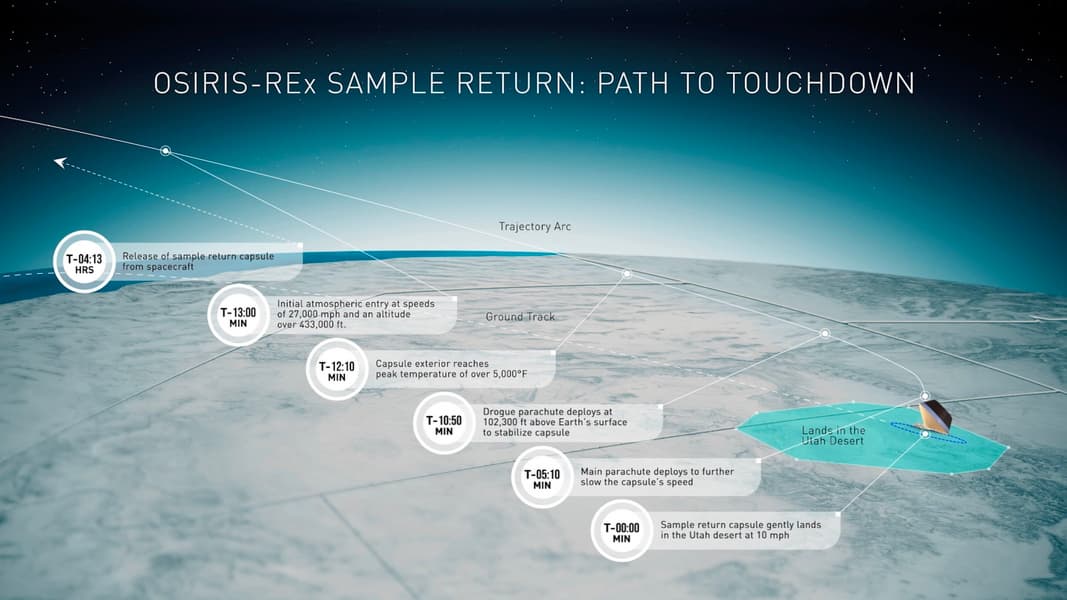 Тем временем, после четырёхчасового путешествия в космосе, капсула проникнет в атмосферу Земли, развивая скорость около 44 500 км/ч. При такой скорости земная атмосфера создаст достаточно тепла, чтобы окружить капсулу образца раскалённым огненным шаром. Защитный щит поможет поддерживать температуру внутри капсулы на уровне, близком к температуре поверхности астероида Бенну.
