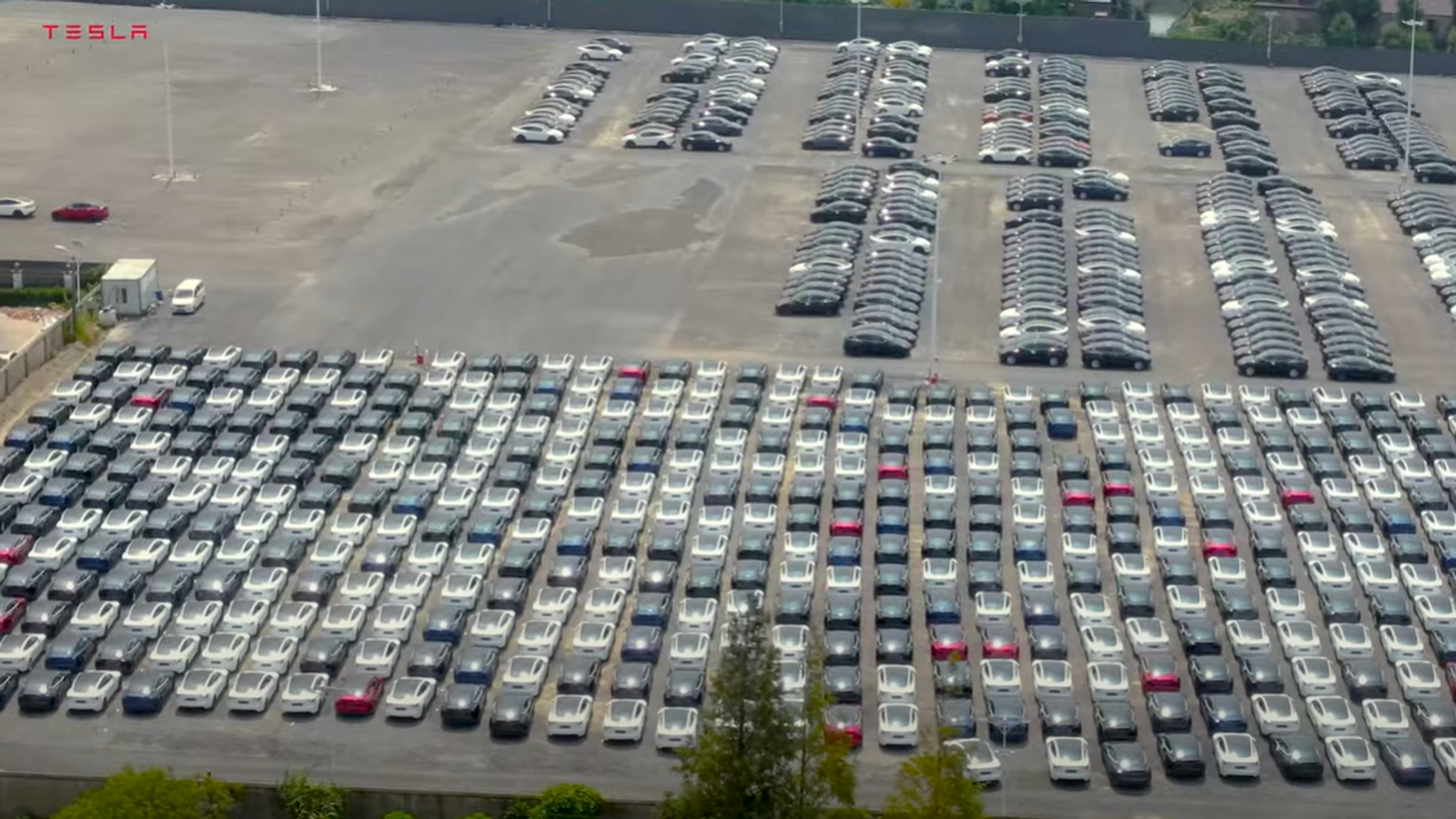 Новые автомобили Tesla Model 3 Highland хранятся отдельно от остальных на одной большой площадке. Больше всего машин белого цвета, но в ролике видны автомобили в чёрном, синем и красном цветах.