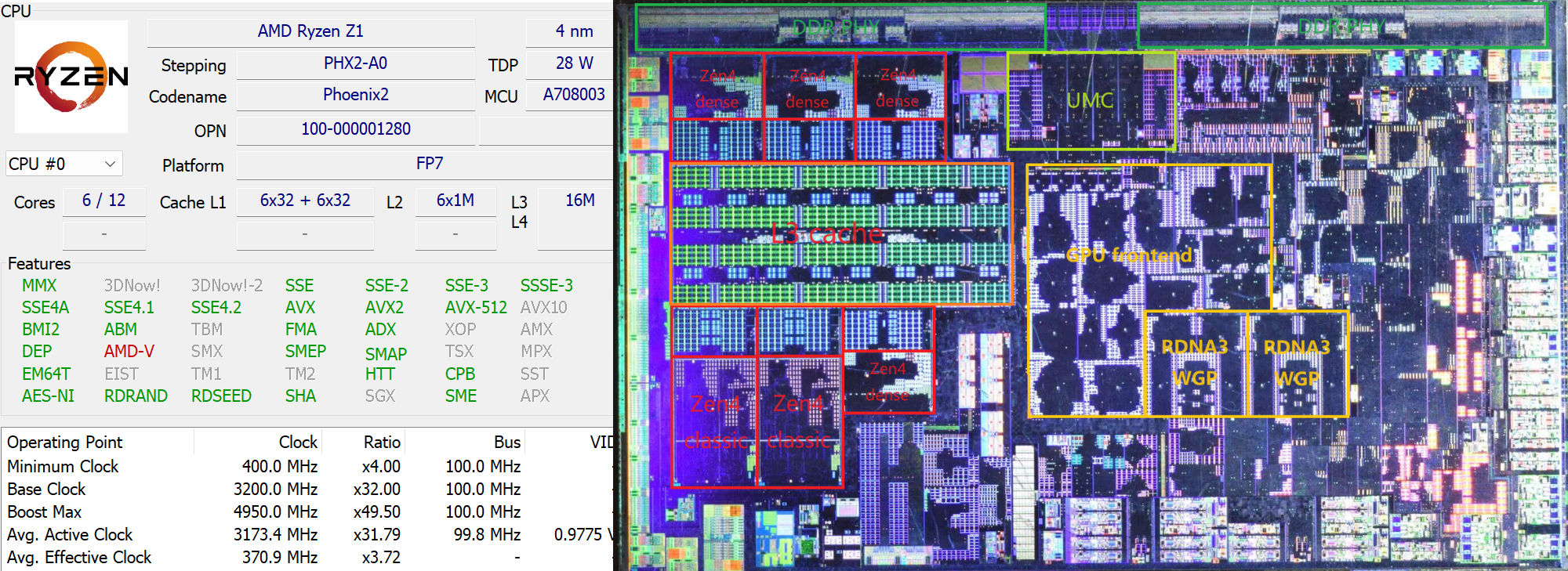 Ryzen Z1 почти технически полностью копирует Ryzen 5 7540U, но отличается настраиваемыми лимитами мощности. Это первые APU из линейки Phoenix2, опирающиеся на новый кристалл, разработанный специально для энергоэффективных мобильных ПК и консолей.