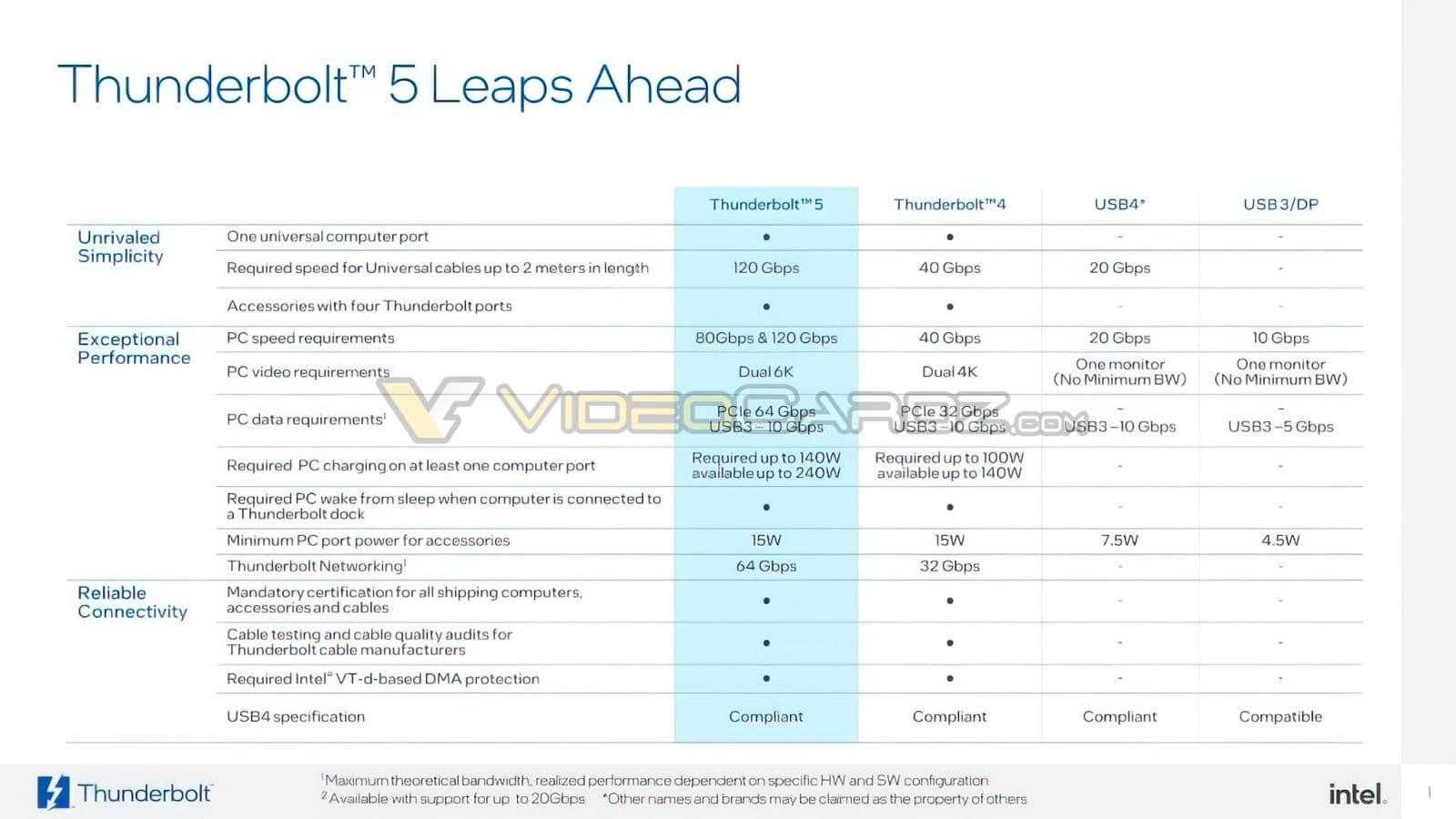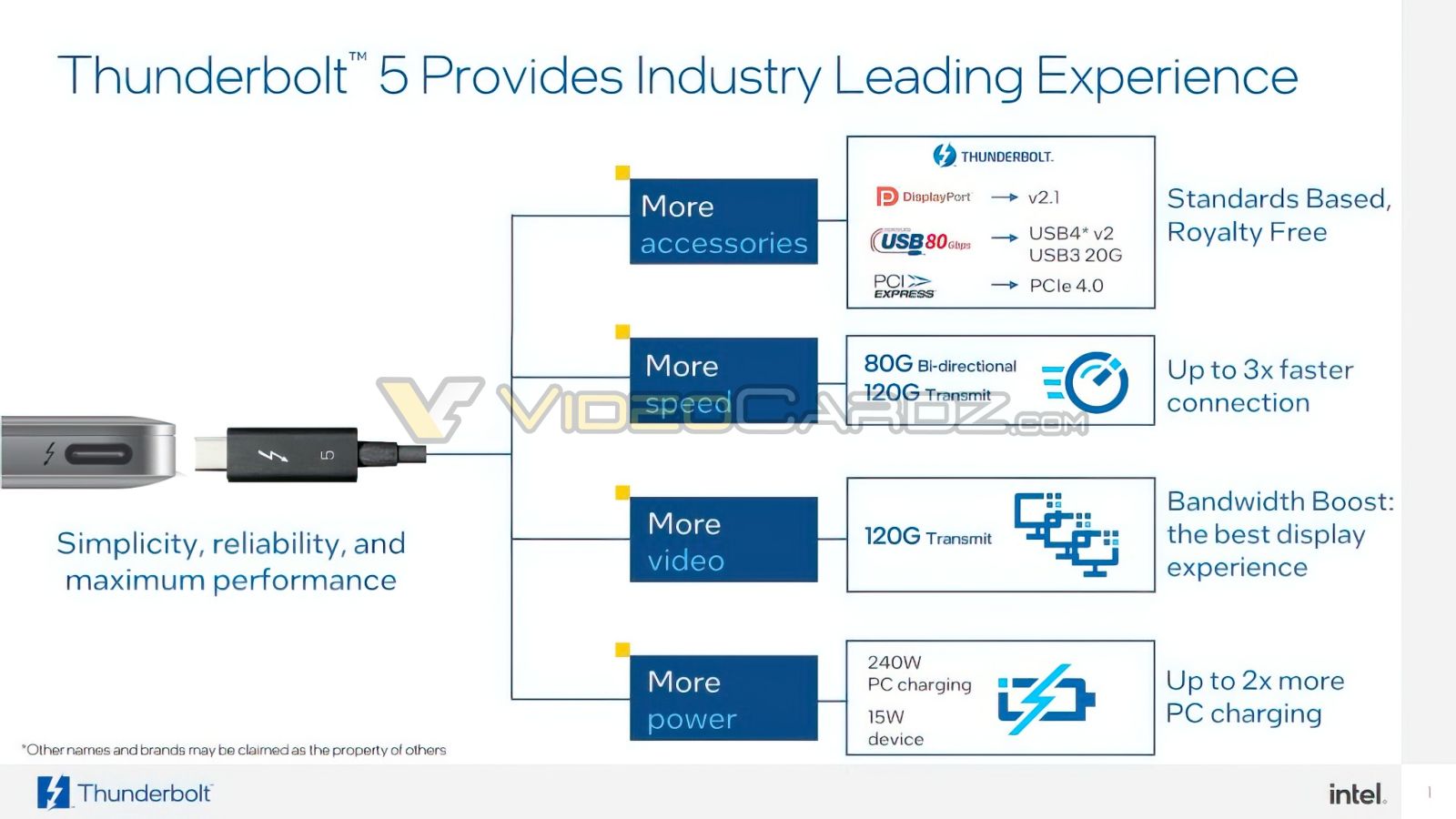 Ресурс Videocardz опубликовал документы из презентации Intel, посвящённой интерфейсу Thunderbolt 5. Источник говорит, что Intel представила этот интерфейс, но на самом деле официального пресс-релиза ещё нет.