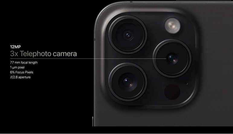 iPhone 15 Pro получил телеобъектив с 3-кратным зумом, а iPhone 15 Pro Max оснащён 5-кратным оптическим зумом с 12-мегапиксельной камерой с фокусным расстоянием 120 мм. Третья, ультраширокоугольная камера имеет разрешение 12 Мп. Также есть макро-режим.