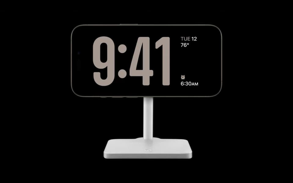 В iOS 17 добавили режим Standby. Смартфон можно установить в горизонтальное положение, после чего он начнёт выполнять роль настольных часов.