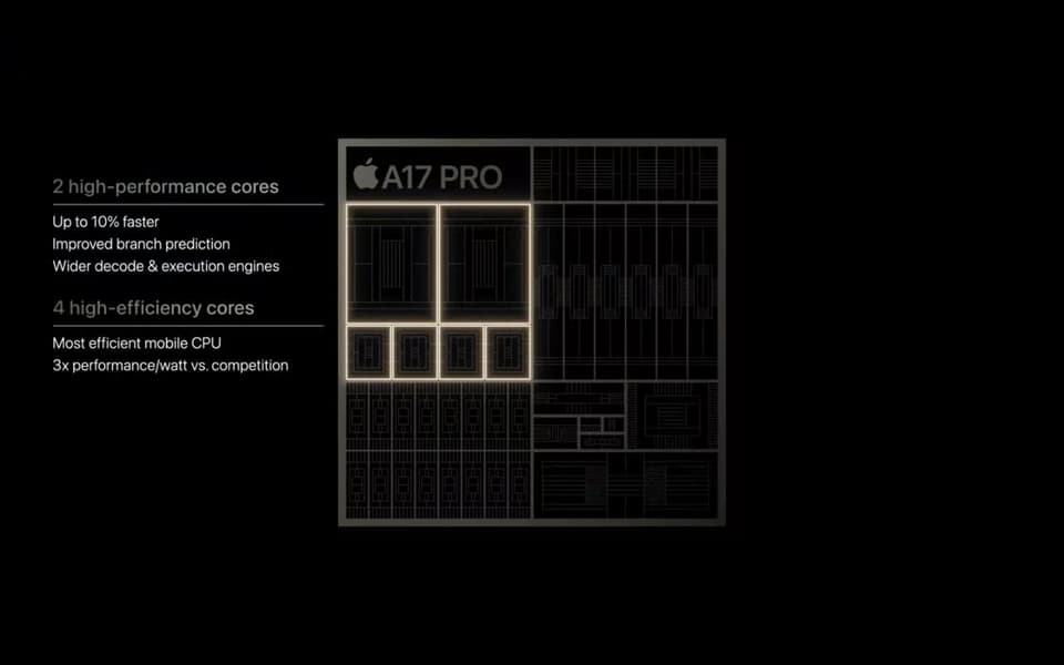 Новые смартфоны получили однокристальную систему Apple A17 Bionic с 6-ядерным CPU и новым графическим ядром. Neural Engine стал вдвое быстрее в приложениях искусственного интеллекта.