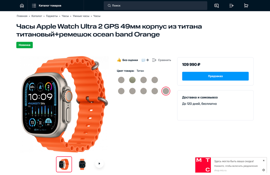 - Apple Watch Ultra 2 (49 мм) — 109 990 рублей.