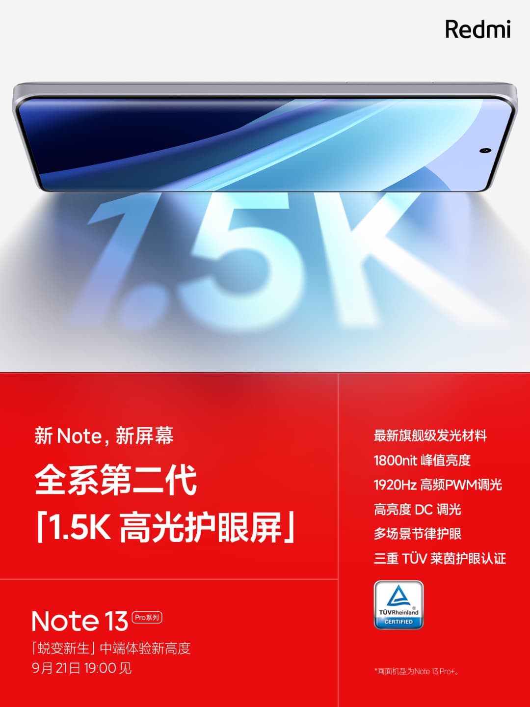В Redmi Note 13 Pro и Redmi Note 13 Pro+ был установлен новый глянцевый экран разрешением 1,5K с защитой глаз от вредного синего света и мерцания второго поколения. Для экрана использованы передовые люминесцентные материалы, значительно повышающие светоотдачу. Пиковая яркость экрана достигает 1800 кд/м2, частота ШИМ равна 1920 Гц.
