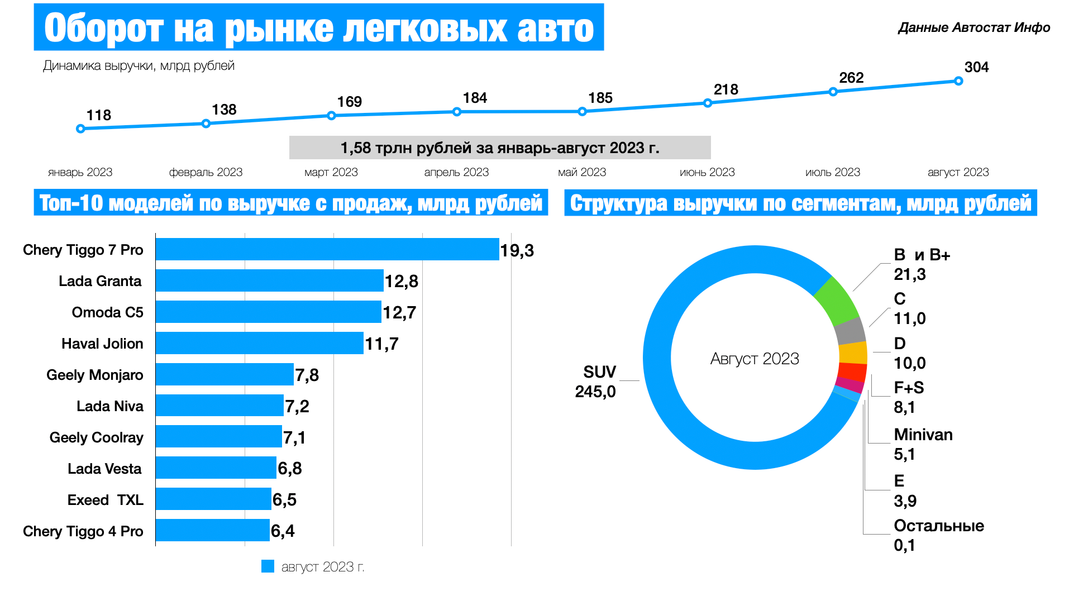 От реализации легковых авто сегментов B и B+ в августе было получено более 21 млрд рублей, а с автомобилей С-сегмента — 11 млрд рублей.