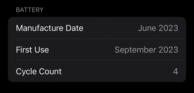Ранее для проверки количества циклов зарядки аккумулятора iPhone использовались неофициальные сторонние приложения. Теперь же информация о количестве циклов заряда батареи отображается на моделях iPhone 15 при выборе меню Settings, General, About. Внизу страницы появился новый раздел «Батарея». Помимо количества циклов зарядки аккумулятора, в разделе также указана дата производства и дата активации.