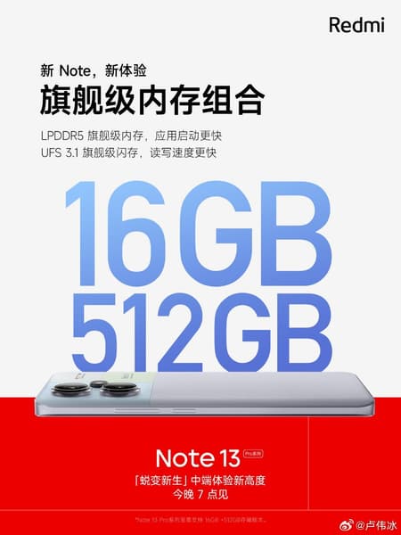 Он подтвердил, что Redmi Note 13 Pro будет доступен в версии с 16 ГБ быстрой оперативной памяти LPDDR5 и 512 ГБ флеш-памяти UFS 3.1. Так что у пользователей не возникнет проблем ни с запуском большого количества приложений одновременно, ни с хранением своих фотографий и видеороликов.