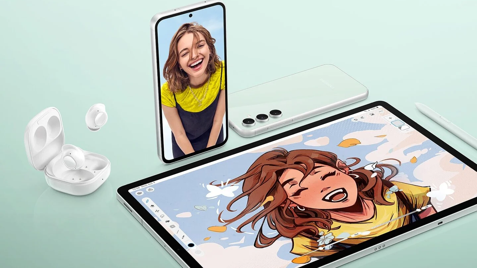 На этой же страничке есть изображения, на которых показаны не только Galaxy Buds FE, но и смартфон Galaxy S23 FE с планшетом Galaxy Tab S9 FE.
