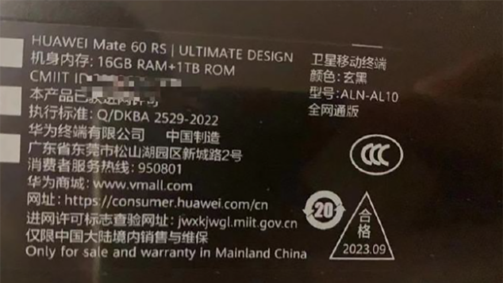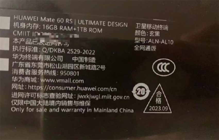 Из данных, нанесенных на коробку, узнаем, что у Huawei Mate 60 RS Ultimate Design (да-да, вместо Porshe Design теперь Ultimate Design, но как это отразится на внешнем виде смартфона – непонятно) 16 ГБ ОЗУ и 1 ТБ флеш-памяти. Цвет – черный, есть поддержка звонков по спутниковой связи. Каталожный номер (ALN-AL10) такой же, как у Mate 60 Pro+, дата производства – сентябрь текущего года.
