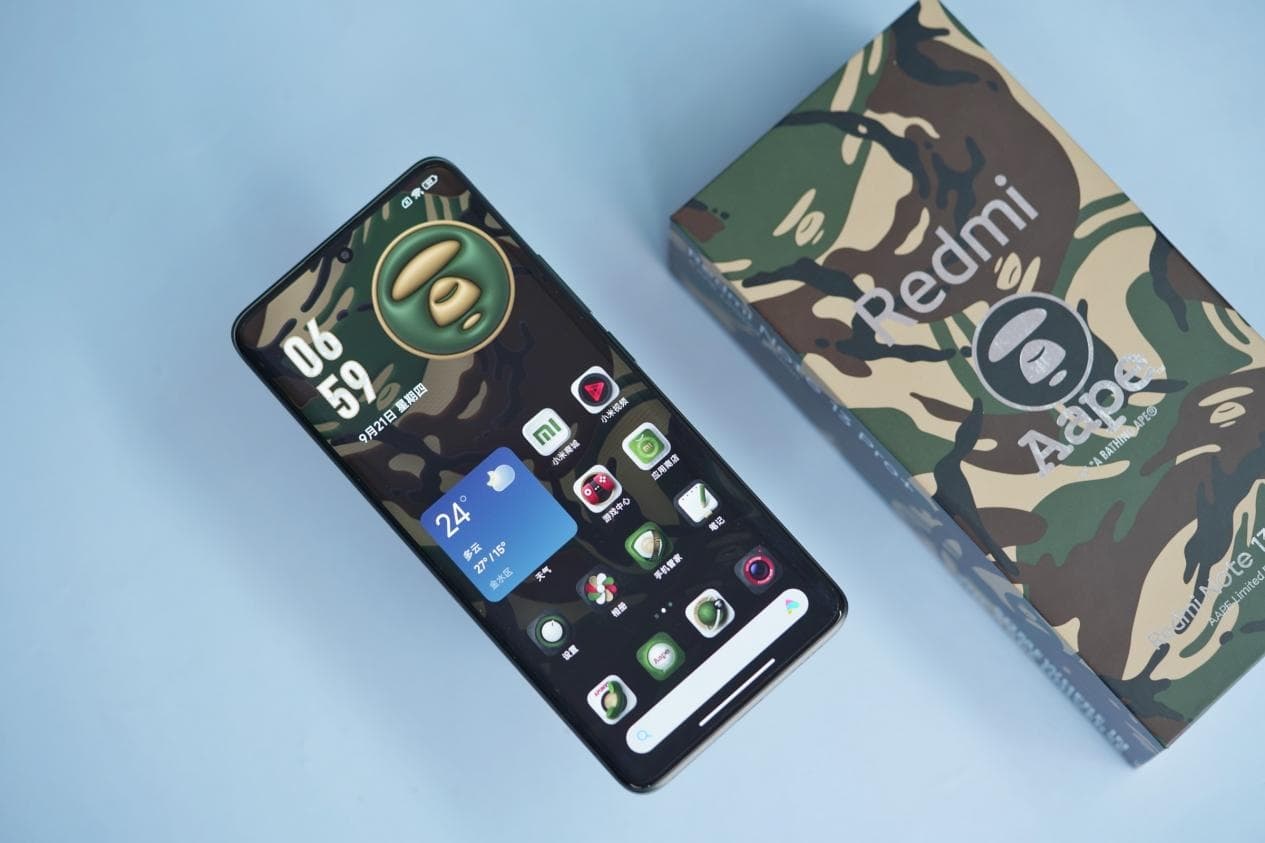 Redmi Note 13 Pro+ AAPE получил эксклюзивные темы, камуфляжные рамки для фотографий и прочий цифровой контент. Комплект поставки включает камуфляжный чехол, а также зарядное устройство и кабель в зелёном цвете.