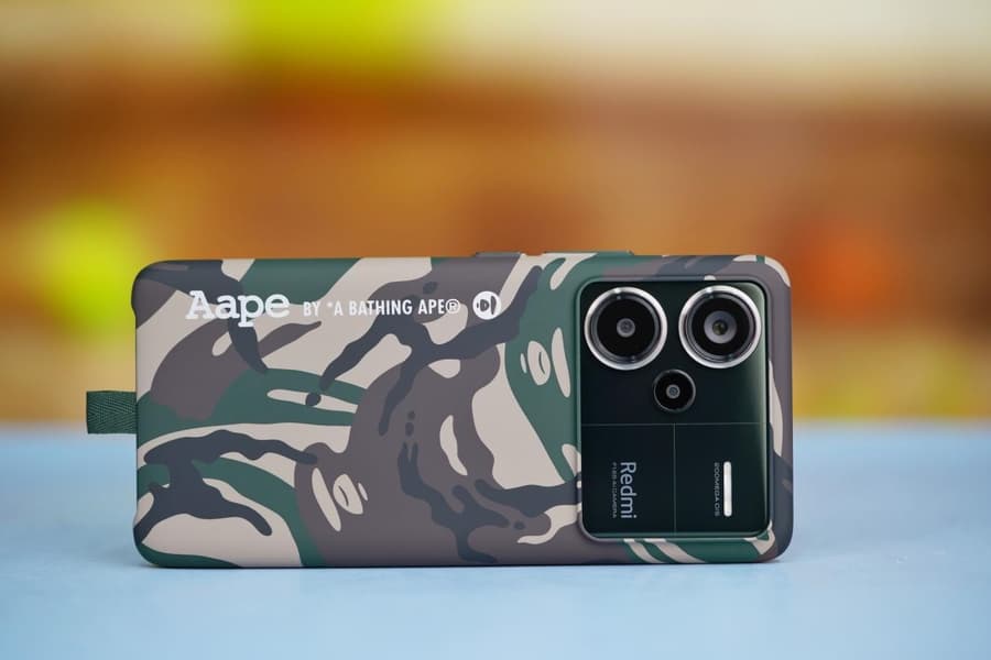 Redmi Note 13 Pro+ AAPE выполнен в камуфляже, средняя рамка/кнопки полностью зелёные, а задняя панель имеет трёхмерный тиснёный логотип AAPE.