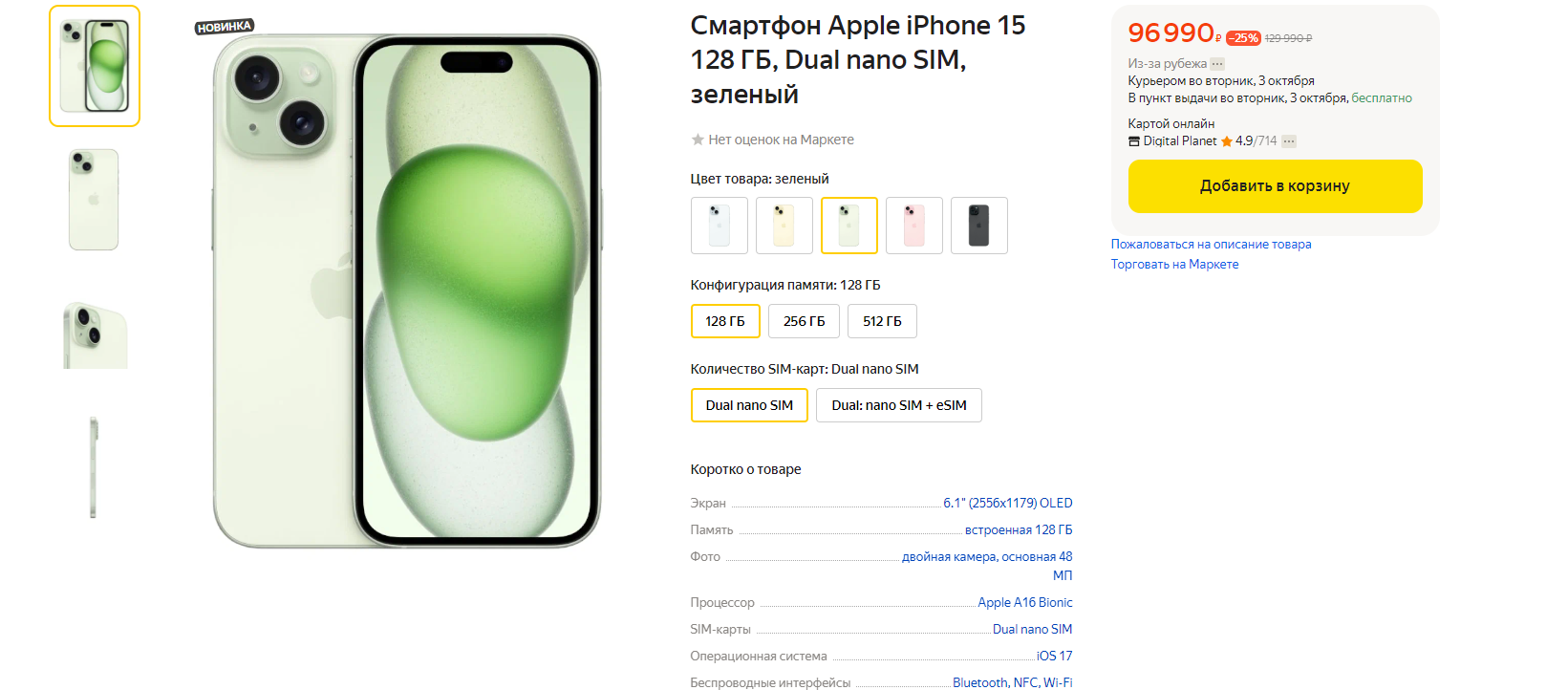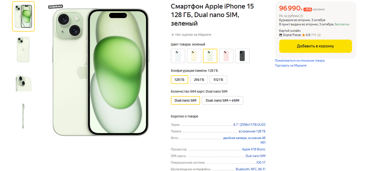 «Яндекс Маркет» уже начал продавать новую партию iPhone 15 со 128 и 256 ГБ флеш-памяти. На текущий момент маркетплейс продаёт смартфоны по самой выгодной цене относительно других крупных ретейлеров. iPhone 15 со 128 ГБ флеш-памяти предлагают за 96 990 рублей, а с 256 ГБ — за 101 990 рублей. Смартфоны обещают доставить 3 октября.