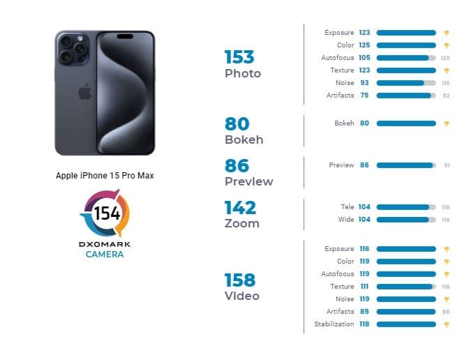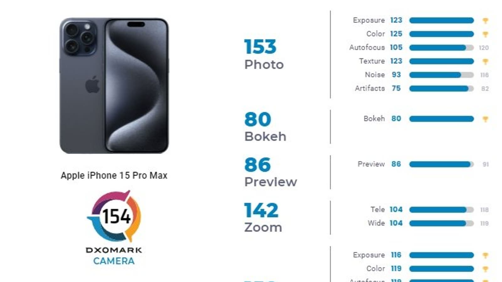 Впрочем, он выступил максимально достойно, заняв второе место и уступив лишь Huawei P60 Pro. iPhone 15 Pro Max получил 154 итоговых балла, 158 баллов за видео и 153 балла за фото. И тут можно отметить, что новинка Apple хоть и не стала лидером в целом, всё же получила максимальный на сегодня балл за качество видео. Тот же Huawei P60 Pro имеет 147 баллов, а Oppo Find X6 Pro, разместившийся на третьем месте, 148 баллов.