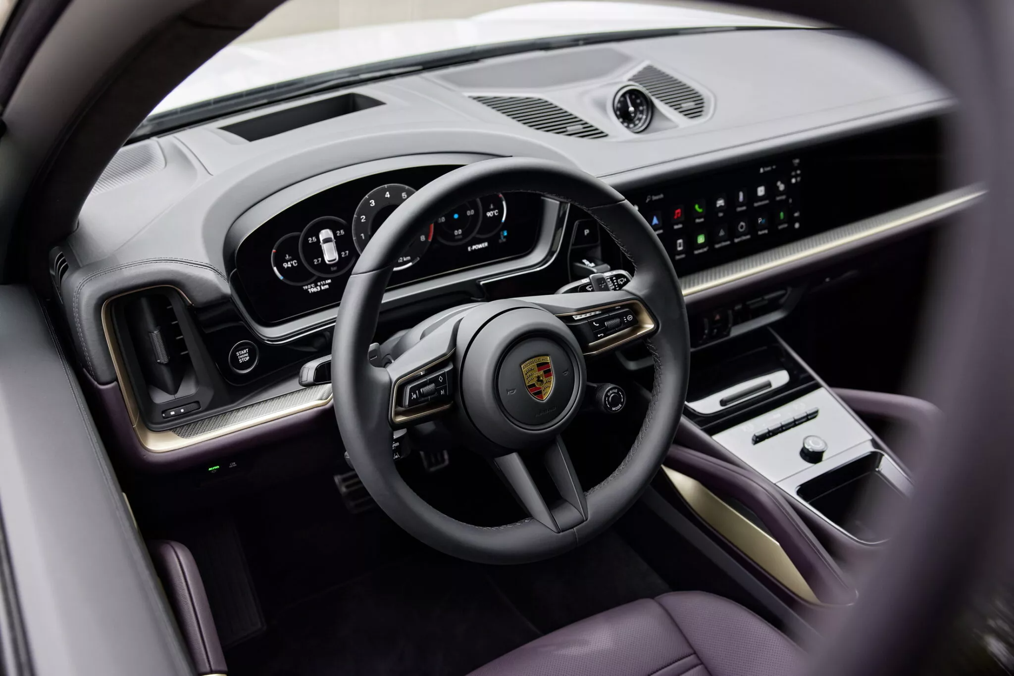 Внутри Cayenne S E-Hybrid оснащён регулируемыми в восьми направлениях сиденьями, пакетом Sport Chrono, накладками на педали из нержавеющей стали. Салон окрашен в цвет Silvershade (пакет отделки называется Diamar). Есть поддержка Apple CarPlay, а также ещё один экран со стороны пассажира.