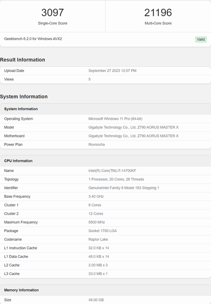 Процессор Intel Core i7-14700KF засветился в Geekbench 6, где показал отличный на фоне предшественника результат.