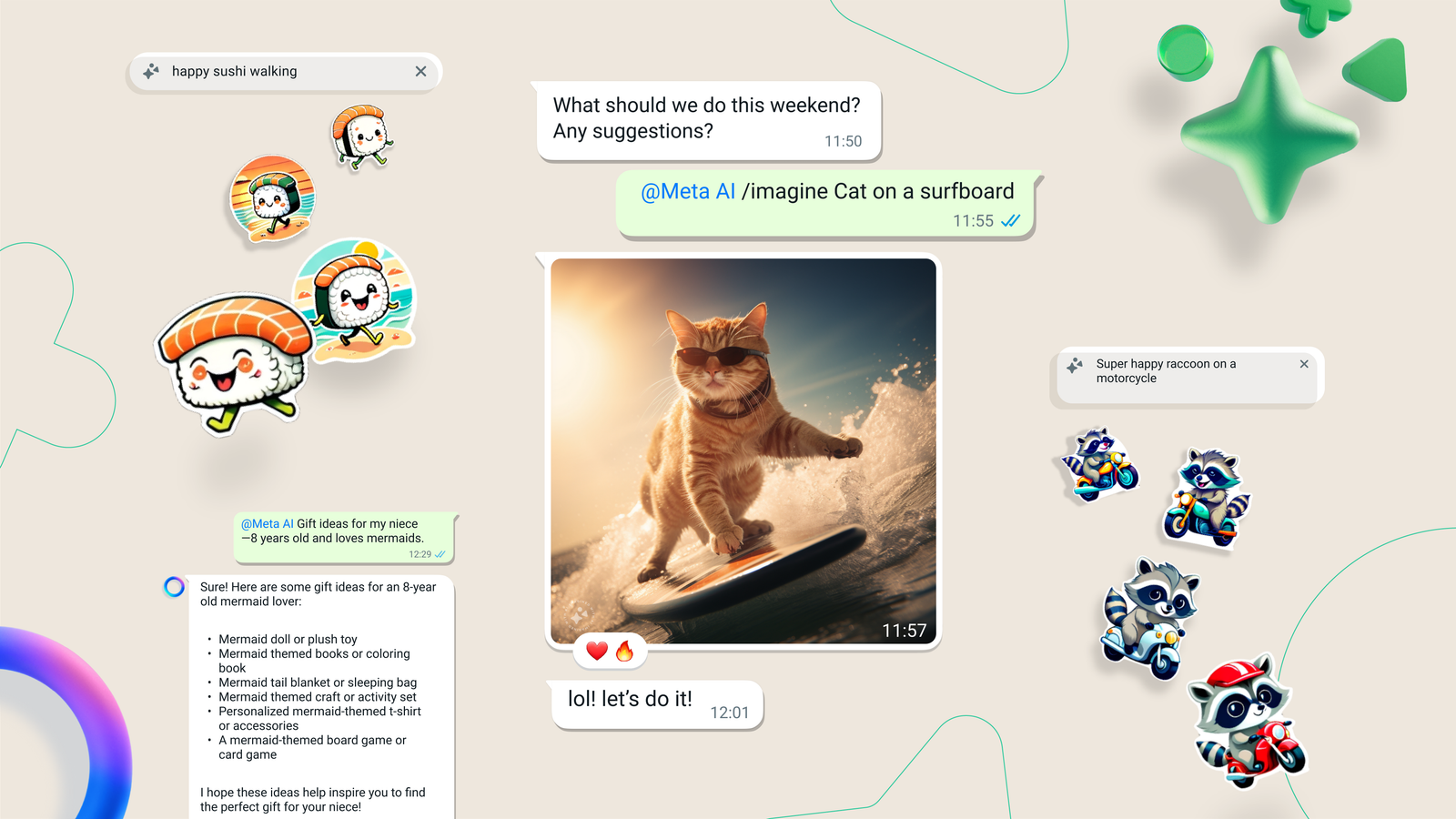 Сразу после конференции некоторым пользователям станут доступны для тестирования в чатах три новых сервиса. Первый — AI stickers (Стикеры ИИ) — позволяет генерировать индивидуальные стикеры.